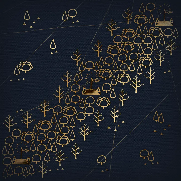 茂密的森林在地图上延伸,将不同团队分隔开。通过随机放置,一条森林带将地图分开。 东方王朝DLC的一部分 |