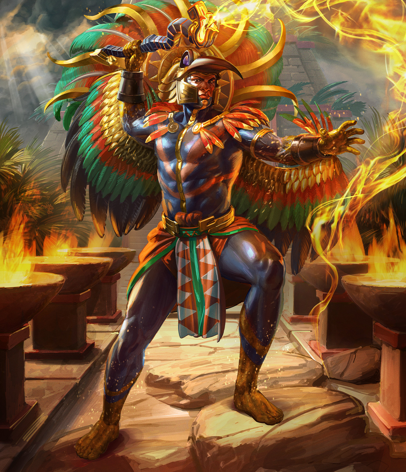 南方之翼(Wings of the South)“维齐洛波奇特利”这个名字直译过来就是“左边的蜂鸟”,在阿兹特克绘制地图的传统里指代南方。墨西加人相信,英勇牺牲的战士死后会升入天堂,每天护送太阳完成昼夜巡游。在这个神圣的岗位上服役四年后,转世成为蜂鸟。信奉“南方的蜂鸟”,让阿兹特克帝国士兵体内充满了取之不尽的疯狂活力。他们毫无畏惧地踏上征途,因为他们知道死亡不过是生命形态的转化。