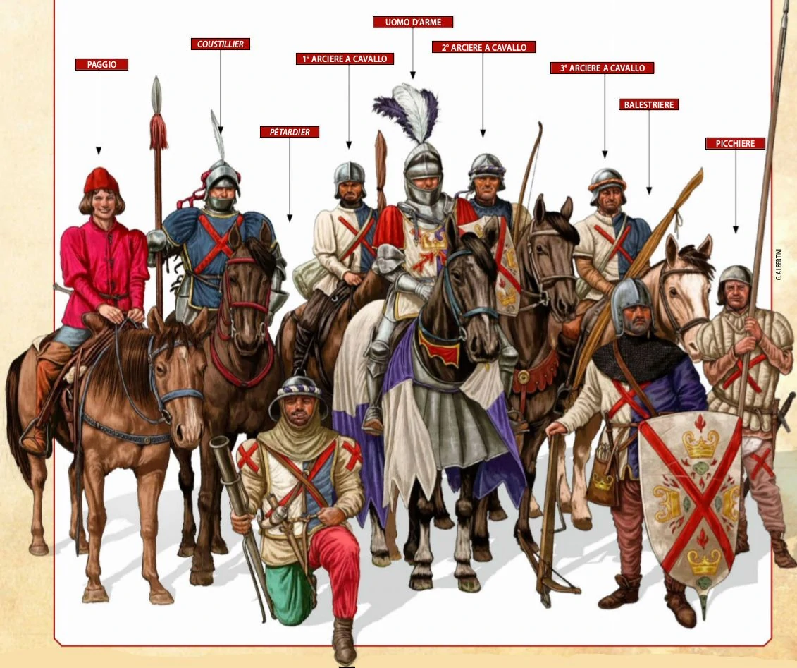 马上轻装兵 精锐马上轻装兵 马上轻装兵(左二),使用勃艮第武士骑枪 法兰西的查理七世王室直属骑士团(Compagnie d'Ordonnance)里面的射手、武士和马上轻装兵