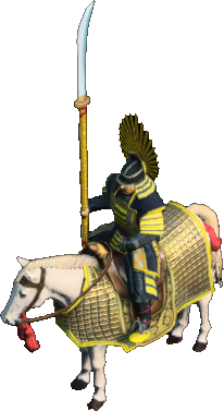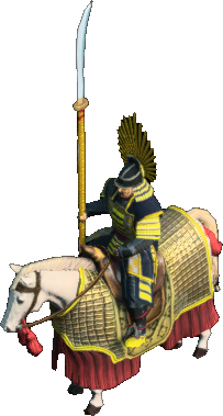 “高生命值、高伤害的近战骑兵,提供的光环可提高附近军事单位的攻击速度。擅长对付近战单位。每个已建造的大名庄园限造一个”