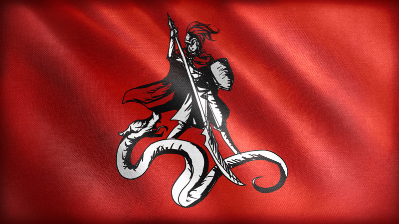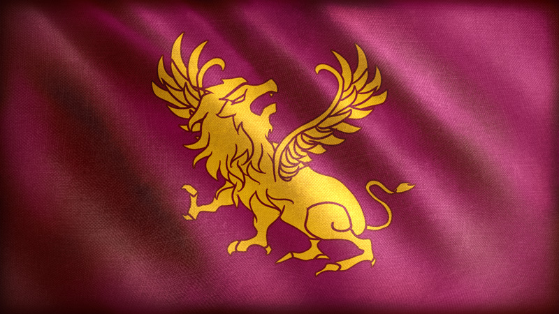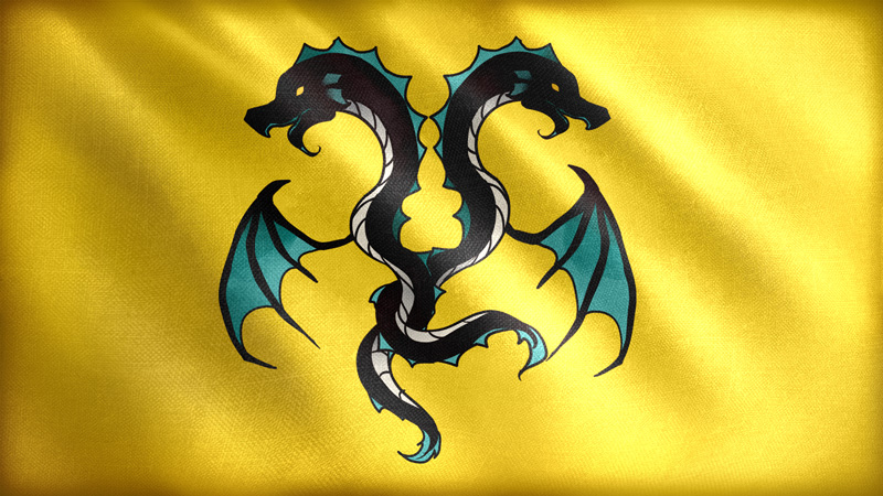 最早旗帜上的巨鱼只有一条,后面吞并伊奥那尼亚帝国元后,发展成了双鱼的样式