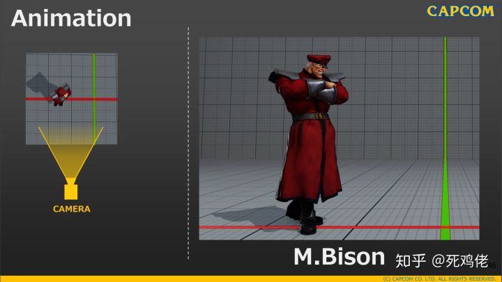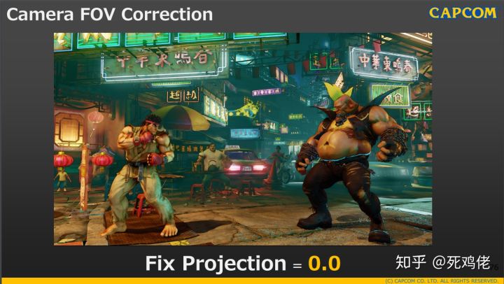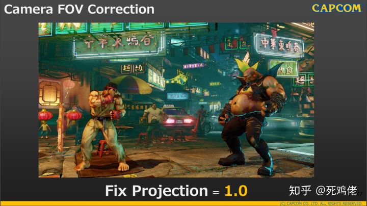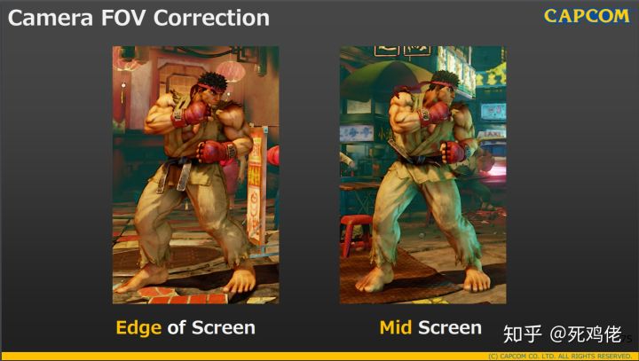 这个效果的手法很简单,其实只是将所有角色的身体角度往摄影机的方向转个 5 度左右就可以了。龟井表示这样的调整若是在一般 360 度的 3D 游戏世界中可能马上就会看到角色动作的不自然感,但由于《街霸5》本质上还是属于 2D 平面类的格斗游戏,摄影机角度是有所限制的,因此这样的调整不但不会不自然,反而能让角色的动作更加符合格斗游戏的需求。