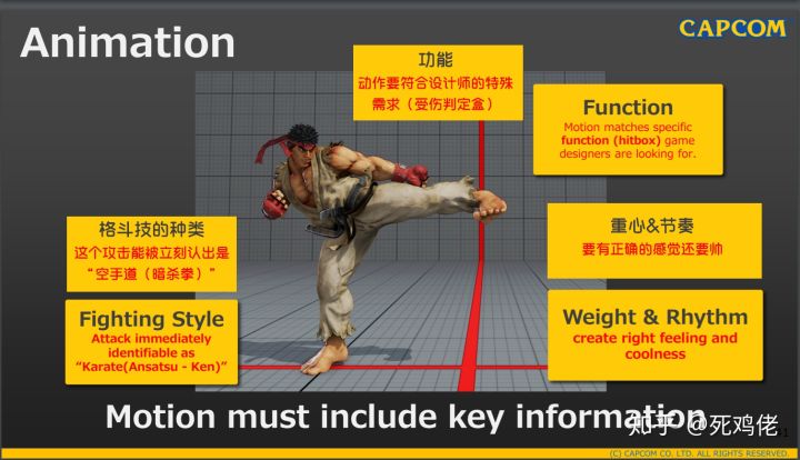 角色的动作设计同样也必须让玩家一目了然,《街霸5》中的动作设计主要考虑以下几个要素:格斗技的种类、攻击的性能,以及动作的重心与节奏。