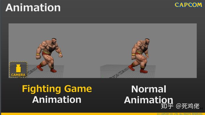 以桑吉尔夫的走路动作为例,如图,相机都是在左下角位置,右边是一般的走路动作,左边是针对格斗游戏调整过后的走路动作,可以感受到调整过后的角色动作,可以看到左边朝摄像机方向旋转了身体。这样的好处是能看到角色背对相机一侧的更多动作细节。