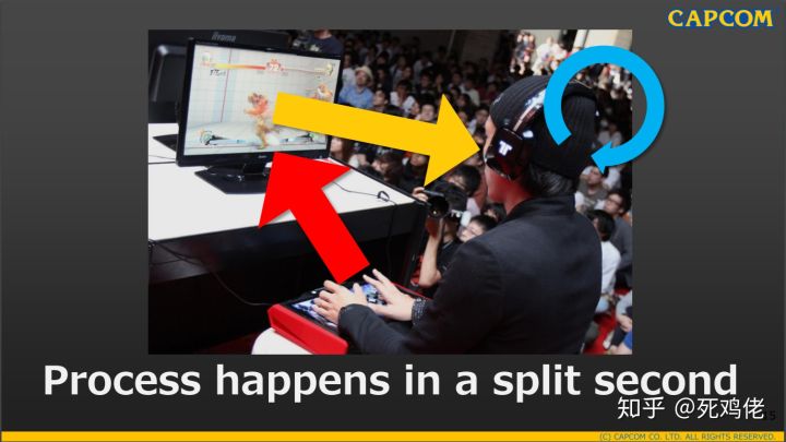 在格斗游戏中,玩家从游戏画面接收信息,然后经过大脑处理信息后,再输入相对应的动作。玩家在进行游戏时,这个流程会以非常快(大约只有 0 点几秒)的频率不断地循环运作。