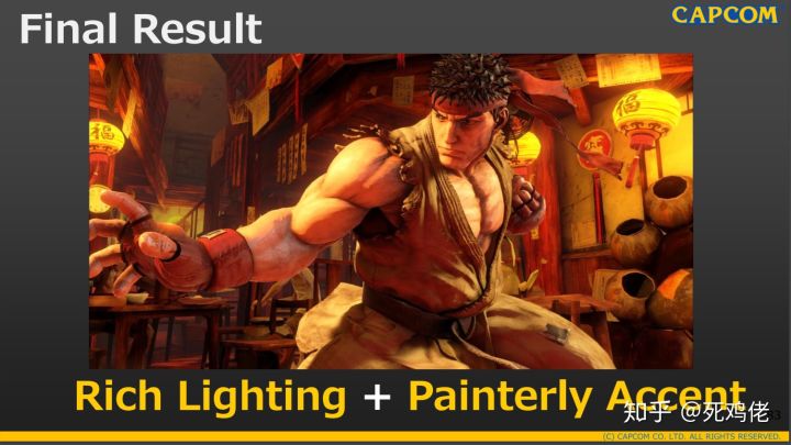 为了要达成这个目标,最终《街霸5》的画面决定以油彩笔触加上丰富的光线控制来呈现由于《街霸5》是1980x1080 的分辨率,跟过去的作品相比可以提供更多的细节在画面表现上。
