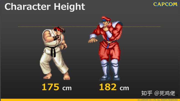 接着我们提到游戏中的角色身高,在《街霸》中的角色都有着官方设定的身高数据,但若是回顾一下 2D 时代的《街霸》,原本身高 182 公分的警察在游戏中看起来却像是身高超过 200 公分的巨人。这是为什么呢?