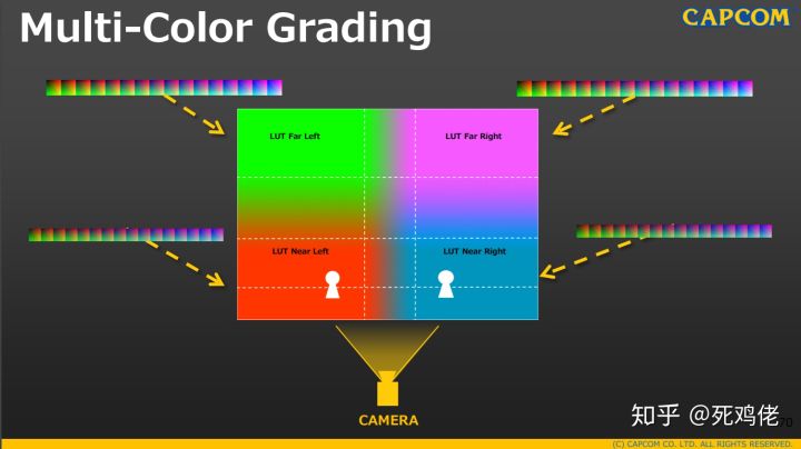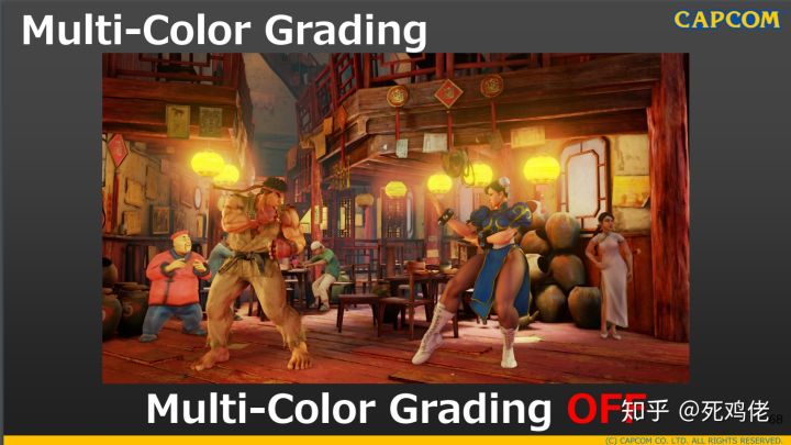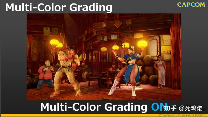 《街霸5》则是利用 Unreal 引擎的 Multi Color Grading(MCG,复数颜色分级) 功能来调整背景的色阶,透过 MCG 的功能甚至能将场景按照前后左右切割成数个不同的区块来做个别的调整。
