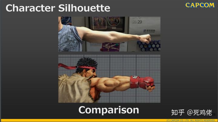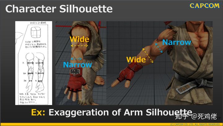 《街霸5》的人物模块参考着这份数据来制作,以隆的手臂为例,可以看到人物模块正面以及侧面的上臂下臂各自具备应有的宽度比例。但有趣的是,如果将游戏的人物模型与现实中的人体部位照片做比对会发现,《街霸5》中的肌肉线条跟真实的肌肉线条相比,其实是有点不符的。