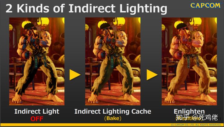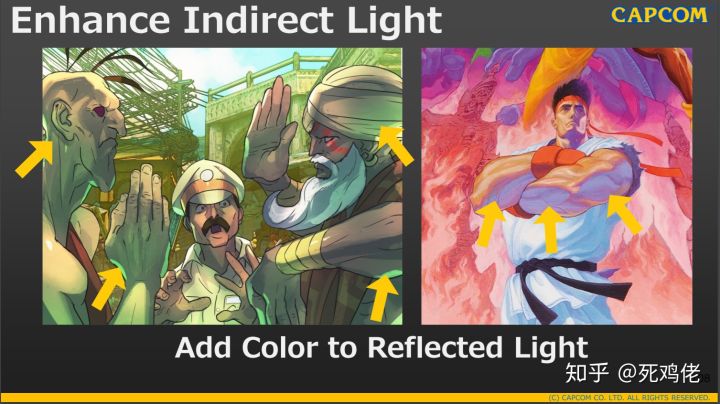 要实现插画风格的最后一点,颜色以及饱和度控制,其实也就是要调整游戏中所有的光线表现。《街霸5》的光线包括原本的环境光以及间接光。间接光可以表现出丰富的色彩。
