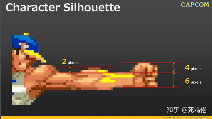 这边龟井以过去 2D 点阵时代的角色阴为例,在仅仅 10 个像素的范围内,开发团队竭尽可能地让阴的正拳传递出「握拳时肌肉该有的线条」之类的信息。